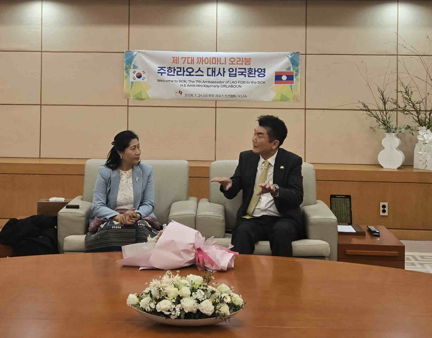 2026년 1월 24일 이른 아침 라오항공 QV 편으로 제 7대 주한 라오스 대사인 H.E Amb Mrs Kaymany ORLABOUN 께서 가족과 함께 인천공항 VIP 실을 통해 한국에 부임 차 입국 하였습니다.